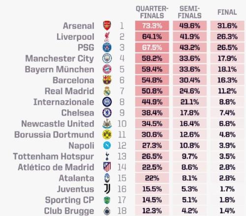 球队晋级16强概率八强概率四强概率决赛概率冠军概率阿森纳89.64%73.33%49.62%31.64%18.09%利物浦58.79%64.14%41.88%26.28%14.7%巴黎圣日耳曼79.87%67.53%43.24%26.54%13.96%曼城61.19%58.21%33.60%17.92%9.71%拜仁68.76%59.38%33.60%18.12%9.5%巴萨54.67%54.81%30.43%16.28%8.25%皇马62.36%50.82%24.62%11.24%4.94%国米54.25%44.88%21.15%8.81%3.73%切尔西37.13%38.36%17.81%7.36%3.51%纽卡斯尔38.96%34.53%16.35%6.85%3.13%
