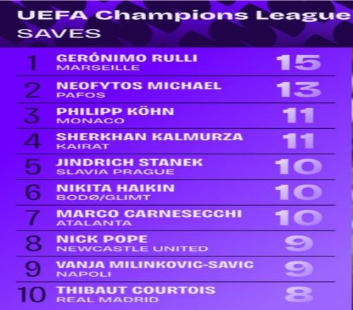 雷速体育10月2日宣 本赛季欧冠联赛阶段已战罢2轮,相关数据机构统计了本赛季欧冠截止目前的门将扑救次数榜。马赛门将鲁利以15次扑救独自领跑,纽卡门将波普和那不勒斯门将萨维奇并列第8,皇马门将库尔图瓦8次扑救排名第10。