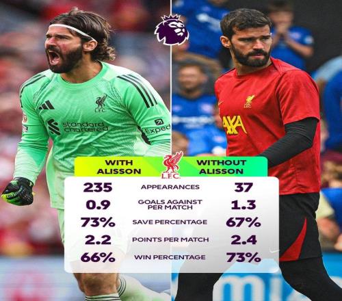 雷速体育10月3日宣 据此前媒体报道,利物浦门将阿利松预计将伤缺6周,随后英超官方也晒出了利物浦有无阿利松的英超联赛数据对比。