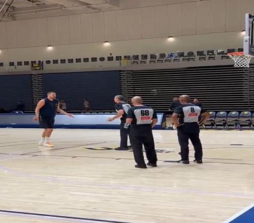 掘金请三名NBA裁判执法队内训练赛,约基奇与他们进行交谈