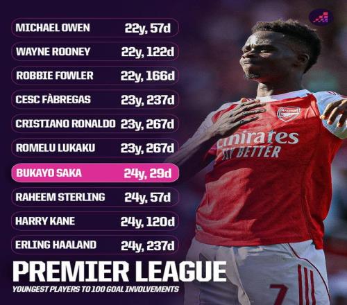 24岁29天,萨卡是英超参与100球第七年轻的球员