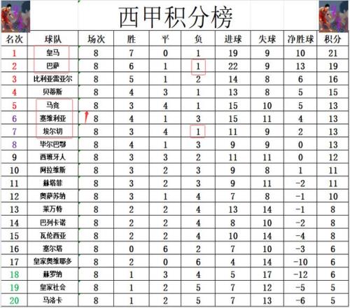 积分榜方面,随着巴萨惨败,升班马埃尔切也输了球,本赛季西甲就再没有不败球队,输球的巴萨还是差皇马2分,无力夺回榜首排在第2。比利亚雷亚尔差巴萨3分排在第3,贝蒂斯赢球后排名继续上升,他们差巴萨4分排在第4。马竞本有机会冲到第4,但是无力赢球的他们,尽管已经7轮不败,但是差贝蒂斯2分排在第5。击败巴萨的塞维利亚追上马竞,1个净胜球的劣势紧随其后排在第6。