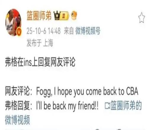 不过最近弗格和球迷互动的时候,表示自己确定会重返CBA赛场,据了解目前包括江苏男篮在内,有三支球队在和弗格进行接触,其中加盟江苏男篮的可能性非常大。