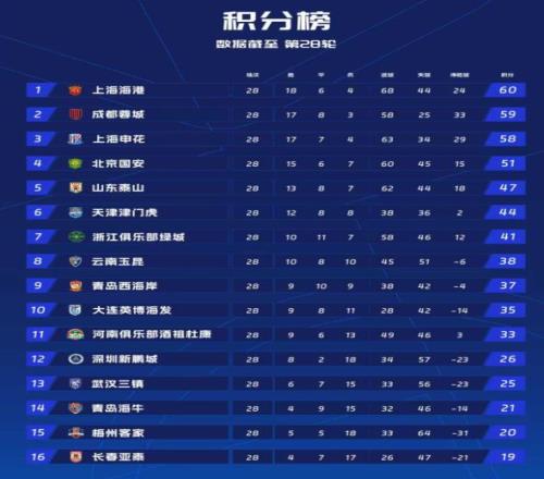 积分榜上,海港60分领跑,成都59分,申花58分,三队依然都有夺冠机会。第29轮,海港主场对阵浙江,成都主场对阵河南,申花主场对阵深圳,三队都没有犯错的空间。第30轮,三队都是客场作战,申花客场对阵天津,海港客场对阵大连,成都客场对阵深圳。