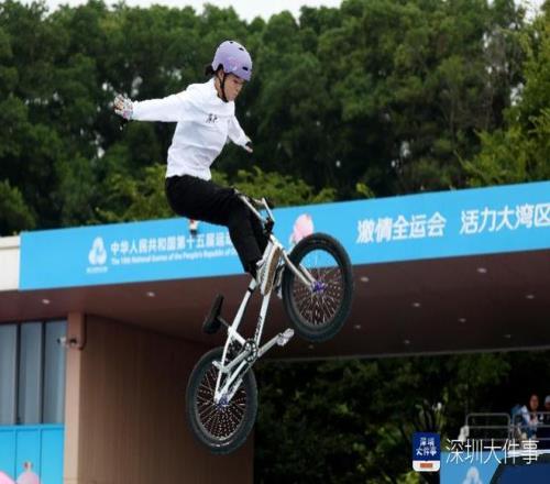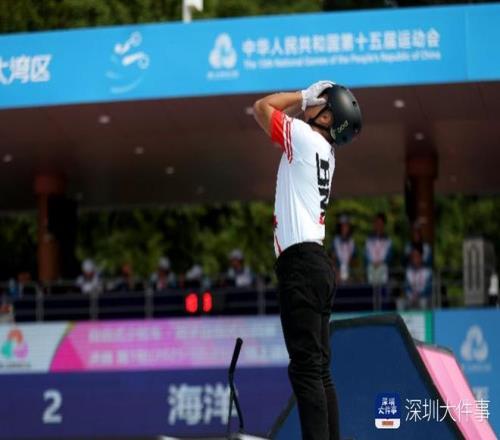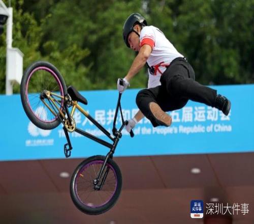 2025年10月25日,十五运会男子自由式公园赛决赛,广东队卢畅在完成动作后激动地把自行车甩向空中。