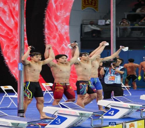 2025年11月10日,第十五届全运会游泳比赛男子4x100米自由泳接力决赛,浙江队(何峻毅、汪顺、沈加豪、潘展乐)夺冠后向观众鞠躬致谢。