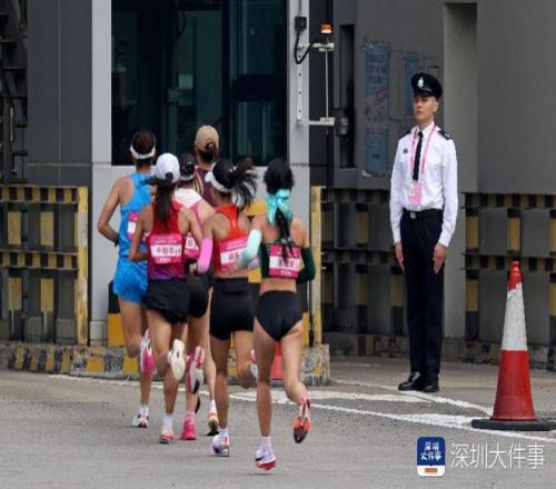 2025年11月15日,全运会首个跨境马拉松开跑,9时许,女子马拉松运动员经过一名站在关口的香港入境署职员。