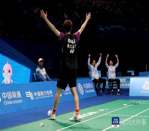 2025年11月14日,十五运会羽毛球女子团体决赛,浙江队的陈雨菲在第3场比赛中取得胜利,她与教练同时举手庆贺。浙江以3:0战胜江苏队获得金牌。