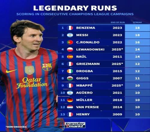 北京时间11月27日,德转统计出了欧冠历史连续最长赛季进球的10位球员,本泽马和梅西同以连续18个赛季欧冠进球排名第一,C罗连续16个赛季进球排名第三。